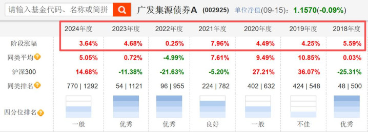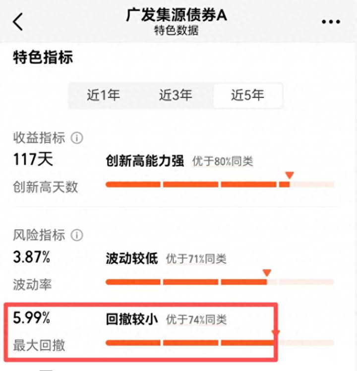 根据东财Choice数据,截至2025年9月15日,在穿越股债牛熊的最近5年,广发集源债券的最大回撤为5.99%,跑赢74%的同类债基!